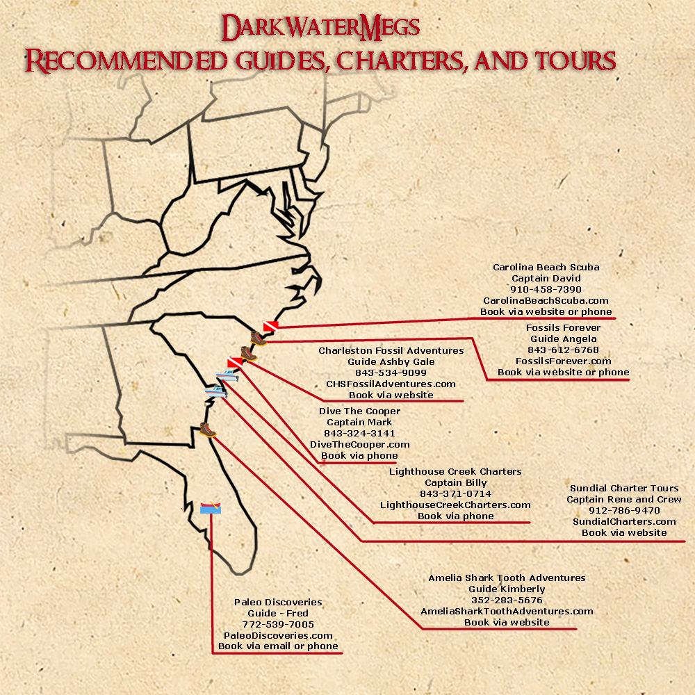 The list you see above is a group of well established businesses that have a long track record of helping charter customers, guided patrons, and tour goers have a nice and safe experience with the chance of finding fossil shark teeth, including megalodon teeth. This list is being provided in order to help people looking for a business that will help them try to find a fossil shark tooth. DarkWaterMegs.com has not been paid or compensated by these businesses, and is providing this list as a resource for those looking for a fossil tooth guide, charter, or tour. You need to research yourself and take the necessary precautions but between the list above and the suggestions below you should be able to connect with a business that will lead you on a fossil megalodon tour, expedition, charter, or guided experience to try to find megalodons or other fossil shark teeth.